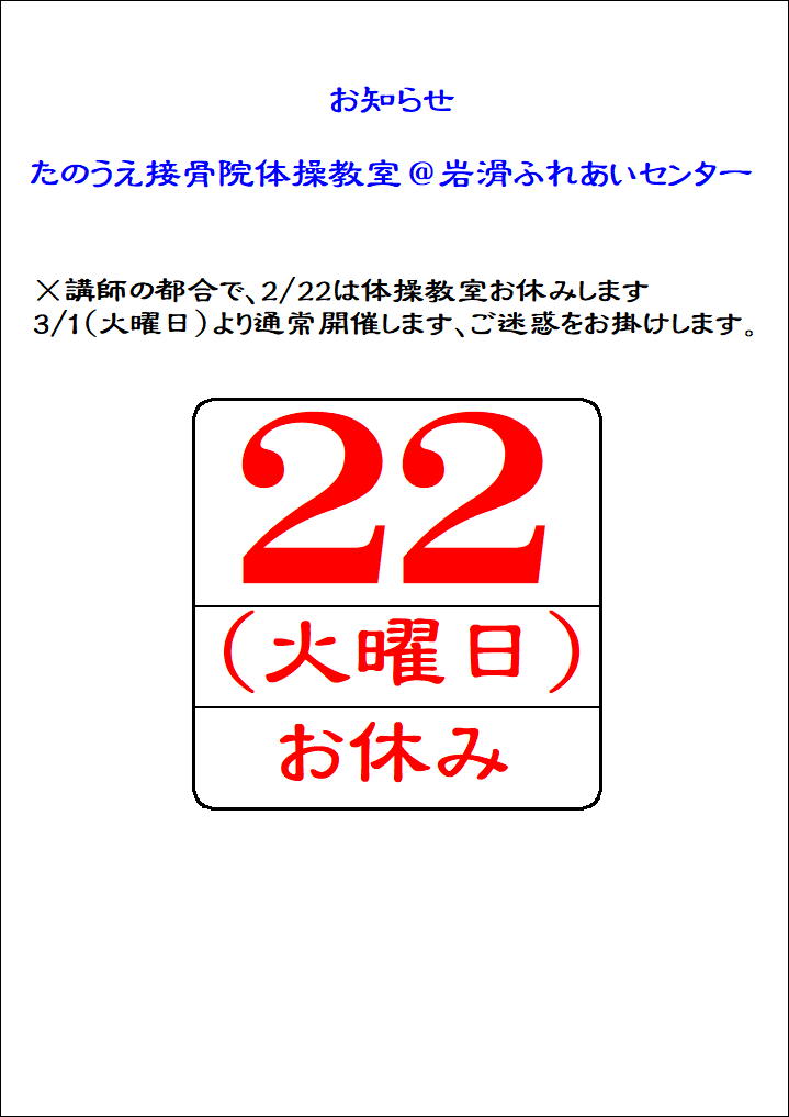たのうえ接骨院体操教室は、2/22(火曜日)1部・2部ともに、お休みします。