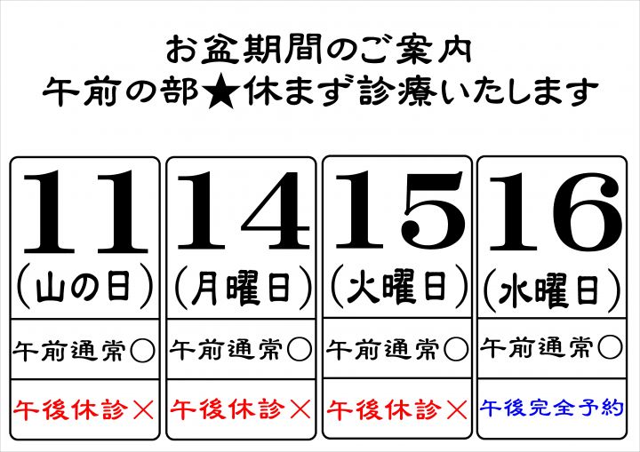 ☆2024【令和6年】8/12(月)振替休日⇒午前の部、午後の部ともに通常通り診療致します。